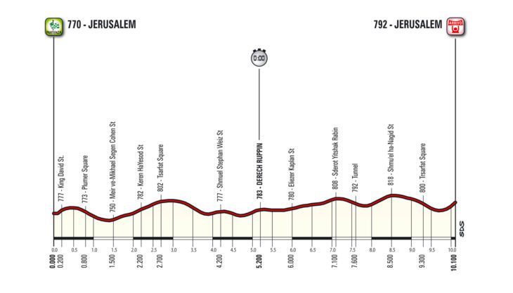 A largada do Giro será na sexta-feira 4 de maio com uma contra-relógio de 10,1 km bastante dura, com traçado todo ondulado dentro da cidade antiga, passando por lugares símbolo como o Parlamento (Knesset) e chegada em pequena subida será perto dos muros da cidade histórica no Portão e Jaffa, ou Portão de David.
