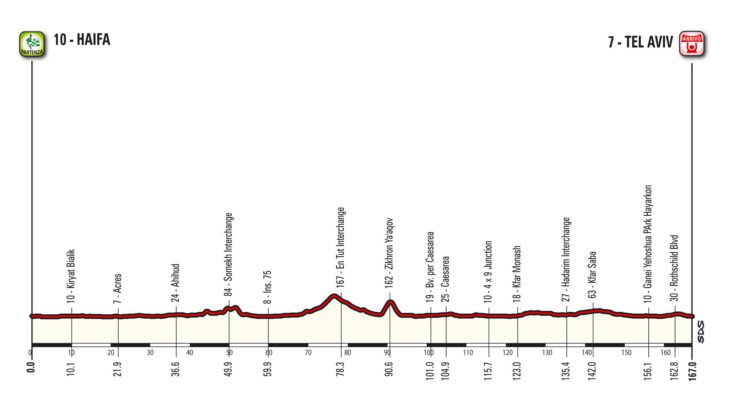 No sábado, 5 de maio, será uma etapa de 167 Km entre Haifa e Tel Aviv em um percurso praticamente plano, não fosse a subida perto e Acri e o Prêmio de Montanha em Zikron Yakov , pouco depois da metade da prova, daí em diante o percurso é praticamente plano para uma chegada em uma avenida às margens do Mediterrâneo aonde será o dia dos velocistas.