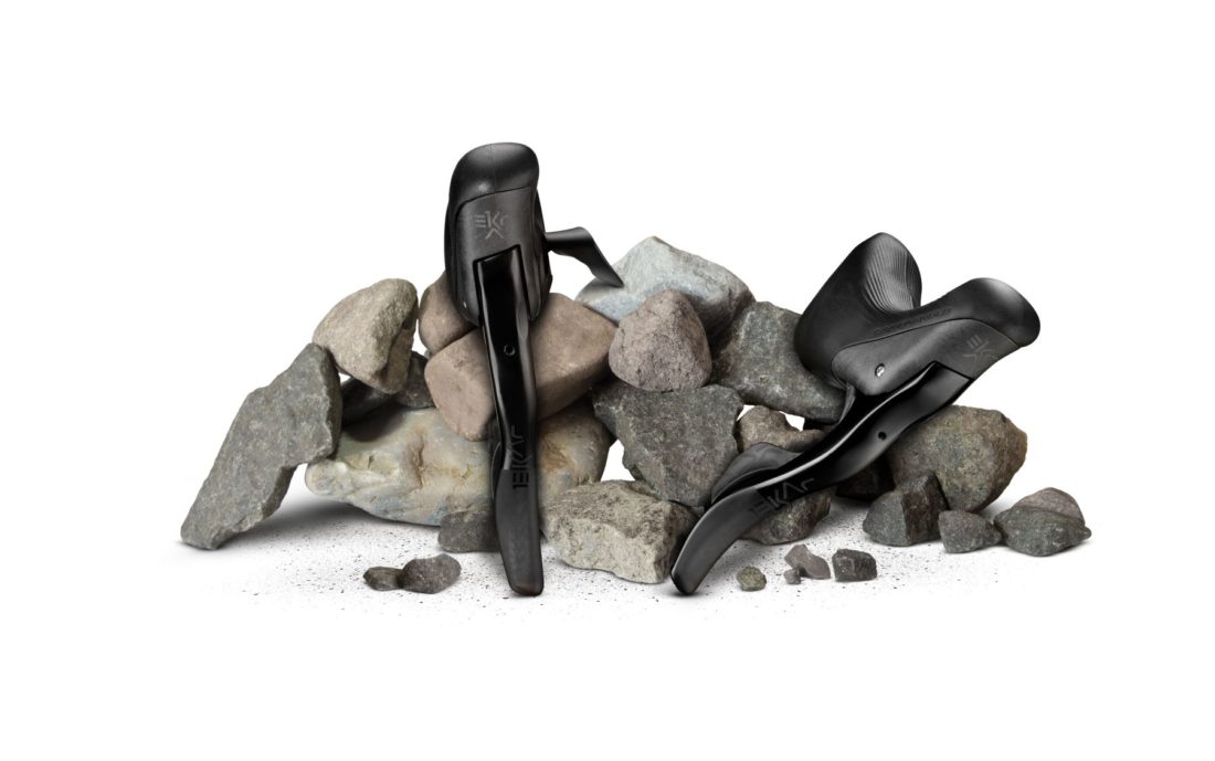 Para o novo desenho da transmissão EkarTM desenvolvida para gravel, optou-se por utilizar a clássica tecnologia dos comandos Ergopower e adaptalo a uma experiencia mais pragmatica e natural para seus uso no fora de estrada.