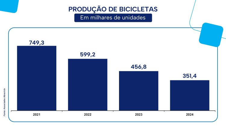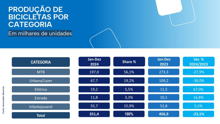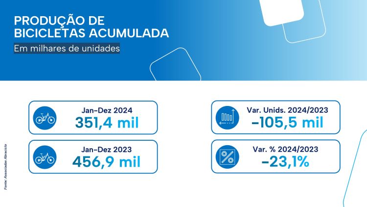 A associação também trouxe dados com a totalização de bicicletas produzidas em 2024, onde 351.400 unidades saíram das 4 fábricas; o volume foi 23,1% inferior ao registrado em 2023 e um pouco abaixo da previsão inicial de 360.000 bicicletas.
