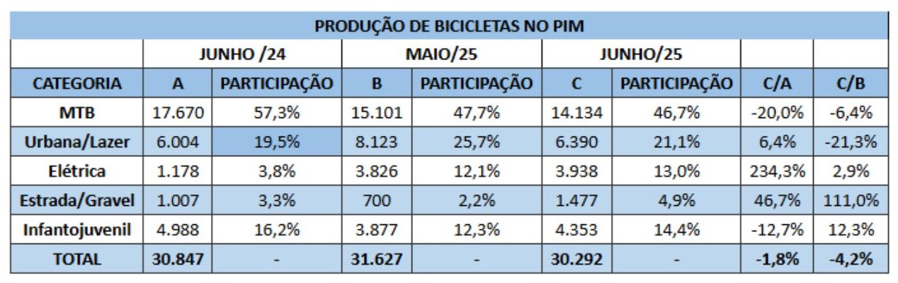 Com números dentro da estimativa para 2025, de chegar à produção total de 320 mil bicicletas até o final do ano, as fabricantes de bicicletas instaladas no Polo Industrial de Manaus – PIM e ligadas à Associação Brasileira dos Fabricantes de Motocicletas, Ciclomotores, Motonetas, Bicicletas e Similares (Abraciclo), produziram 180.533 unidades no primeiro semestre deste ano, uma queda de 1,6% em relação ao mesmo período do ano passado.