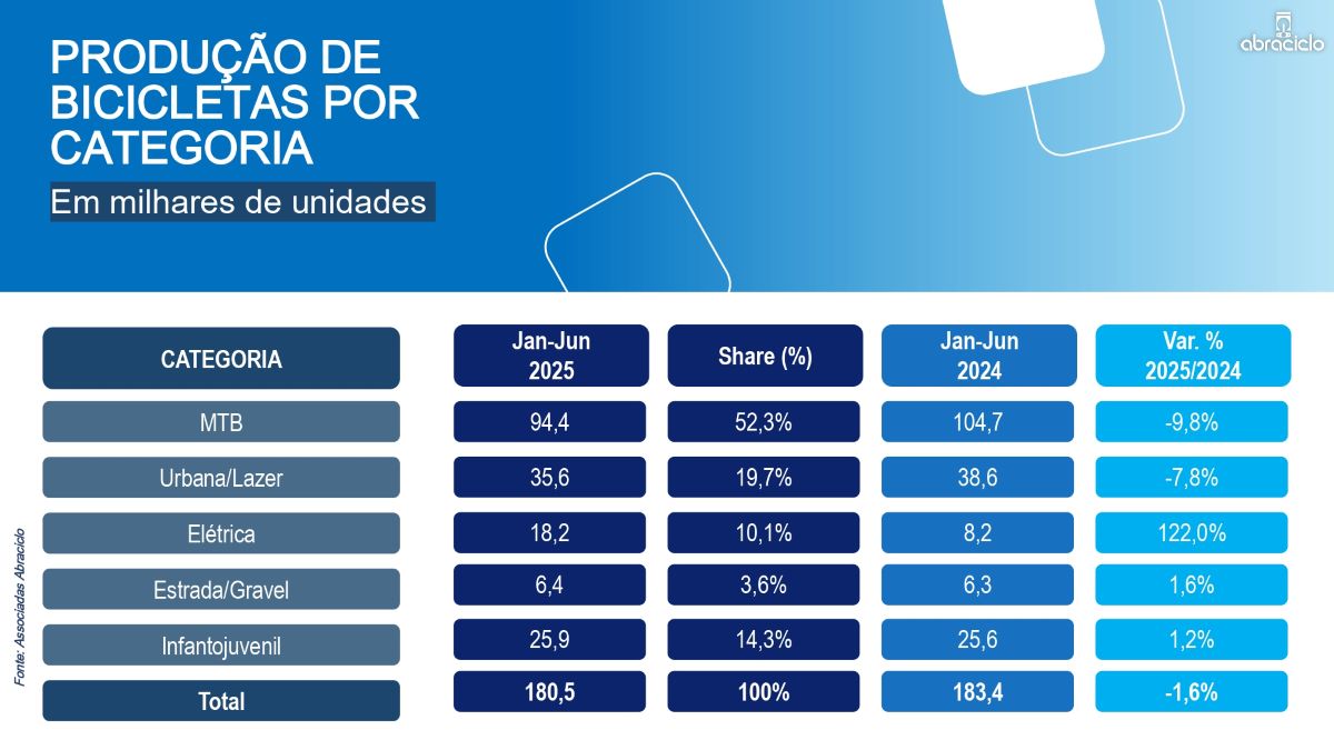 As bicicletas do tipo mountain bike – que englobam desde os modelos de entrada ao topo de linha, ainda é a categoria mais produzida, e no primeiro semestre foram 94.386 unidades, representando 52,3% do volume total, porém com uma redução de -9,8% em relação ao mesmo período do ano passado. A seguir vem os modelos do tipo Urbana/Lazer com 19,7% da produção e uma queda de -9,8% se comparado a 2024, a terceira posição é dos modelos Infantojuvenil com 14,3% do total.