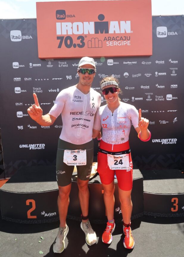 Deu Brasil na última etapa da temporada do Circuito Itaú BBA IRONMAN 70.3. A manhã do último domingo, 30/11, marcou momentos de redenção e celebração para Fernando Toldi e Vittória Lopes, que finalmente transformaram o “quase” em vitória ao triunfarem no IronMan70.3 Aracaju-Sergipe. Após ficarem muito próximos do topo do pódio nas etapas anteriores, os dois triatletas encontraram na capital sergipana – mesmo sob um calor intenso que elevou o grau de dificuldade – condições ideais para construírem a sua vitória